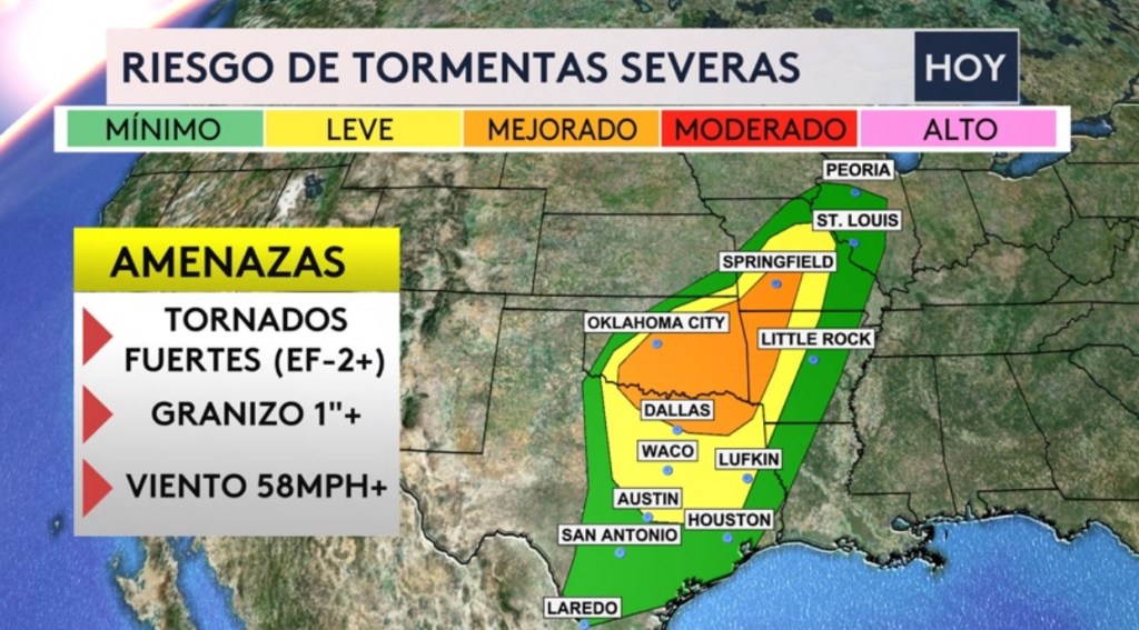 •Estaremos vigilando un sistema de baja presión cerca de la frontera de México y Texas que estará trayendo el riesgo de tiempo severo hoy para Nuevo México y Texas. Ciudades riesgo leve son Midland, Sonora, Odessa y Del Río. Bajo un riesgo mínimo se encuentran San Antonio, Austin, Abilene y Lubbock. Las amenazas principales serán tornados, granizo de más de 1 pulgada en diámetro y vientos dañinos de más de 58 mph.