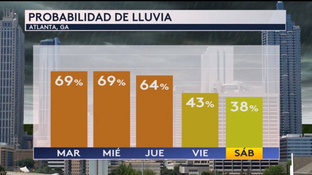 •Las probabilidades de lluvia empiezan a bajar ligeramente a partir del fin de semana en Atlanta, Georgia