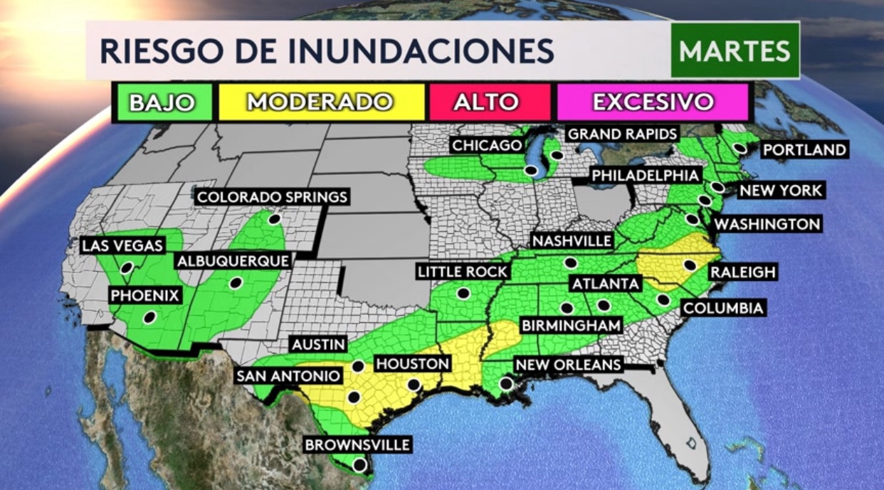 Para hoy, el riesgo de inundaciones se expande a través de una gran zona: desde Texas hasta Maine pero también incluye al suroeste del país (lluvia de monzón) y los Grandes Lagos. Grandes ciudades como Nueva York, Chicago, Washington, Philadelphia, Atlanta, New Orleans, Houston, Austin, San Antonio, Las Vegas y Phoenix estarán bajo algún tipo de riesgo hoy