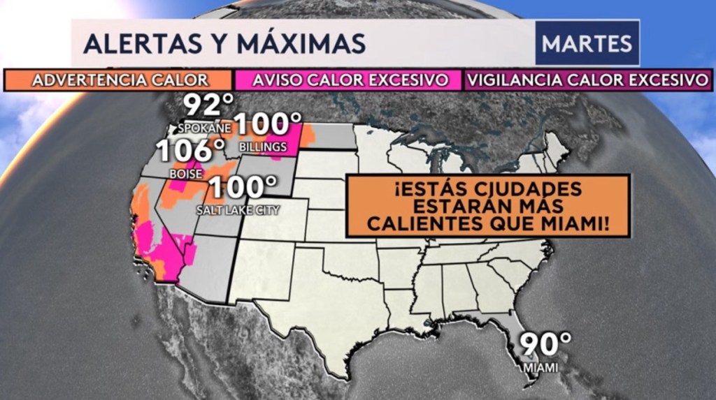 •Siguen en vigor las alertas por calor excesivo para el oeste del país donde ciudades como Palm Springs, Fresno, Sacramento, Las Vegas, Salt Lake City, Boise y Billings estarán en los tres dígitos hoy. ¡Algunas de estas ciudades al extremo norte del país, incluyendo a Spokane en Washington, Billings en Montana, Salt Lake City en Utah y Boise en Idaho estarán más calientes hoy que Miami!