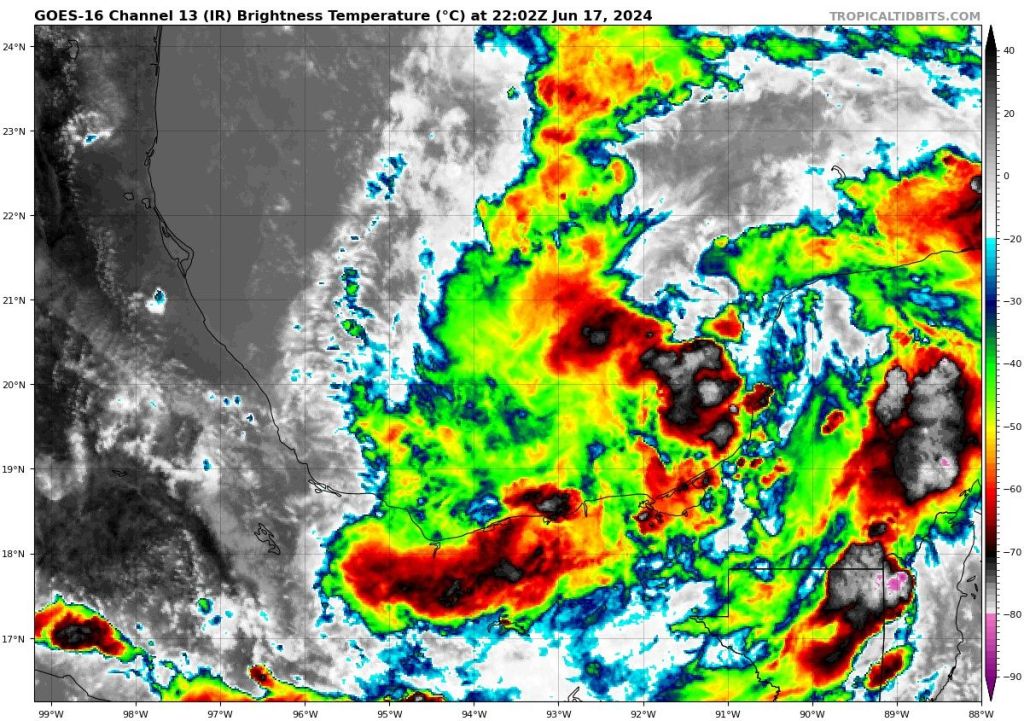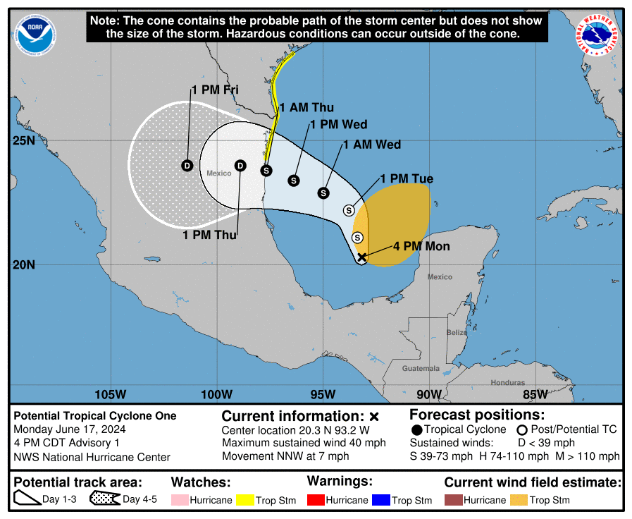 •Nos vamos para el Golfo de México, donde estamos vigilando el Potencial Ciclón Tropical 1. Se espera que se acerque a la costa de México tarde por la noche el miércoles y por la madrugada del jueves. Pudiera estar tocando tierra entre las ciudades De San Fernando y Tampico en el estado de Tamaulipas como tormenta tropical (en este caso les daremos el nombre Alberto) con vientos sostenidos de 50 mph