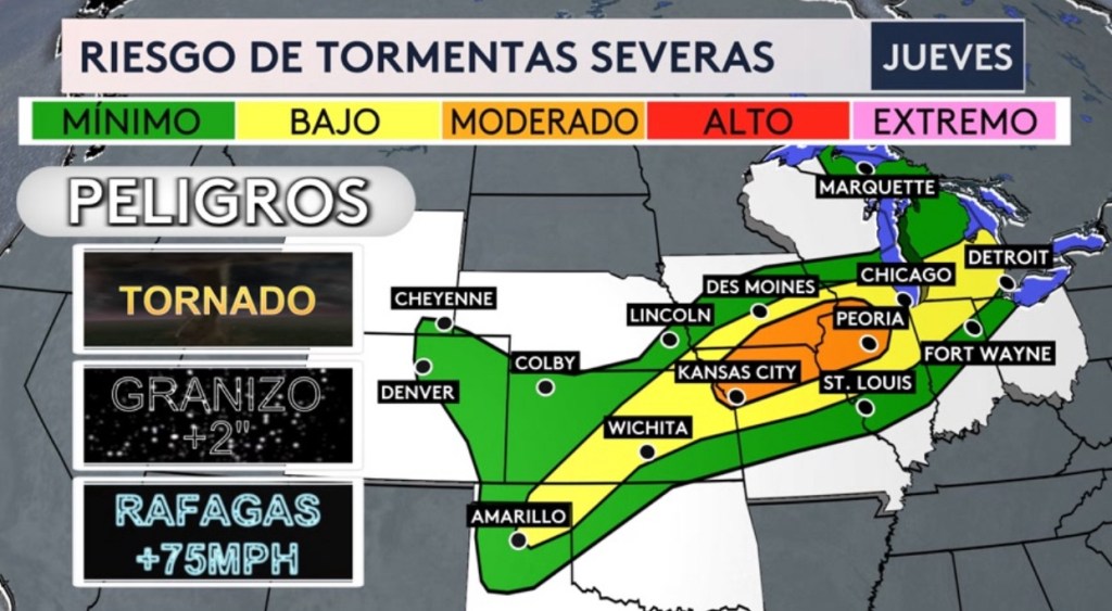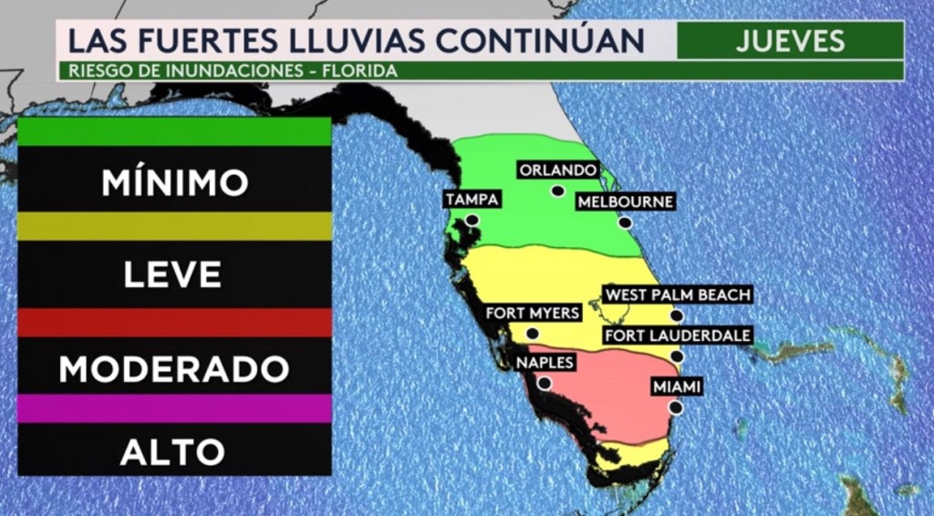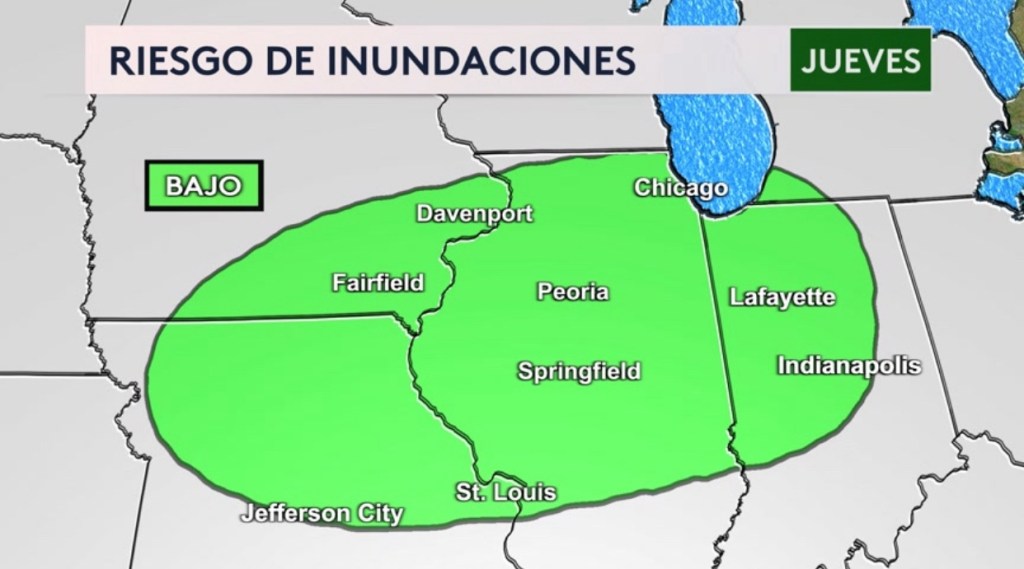 •Riesgo de inundaciones hoy desde Louisiana hasta Texas con ciudades como Houston y Bay City en Texas bajo un riesgo moderado (sombra roja y nivel 3 de 4 en la escala de inundaciones), principalmente esta noche y por la madrugada el miércoles