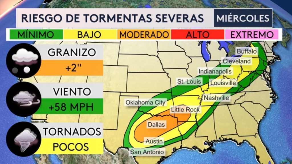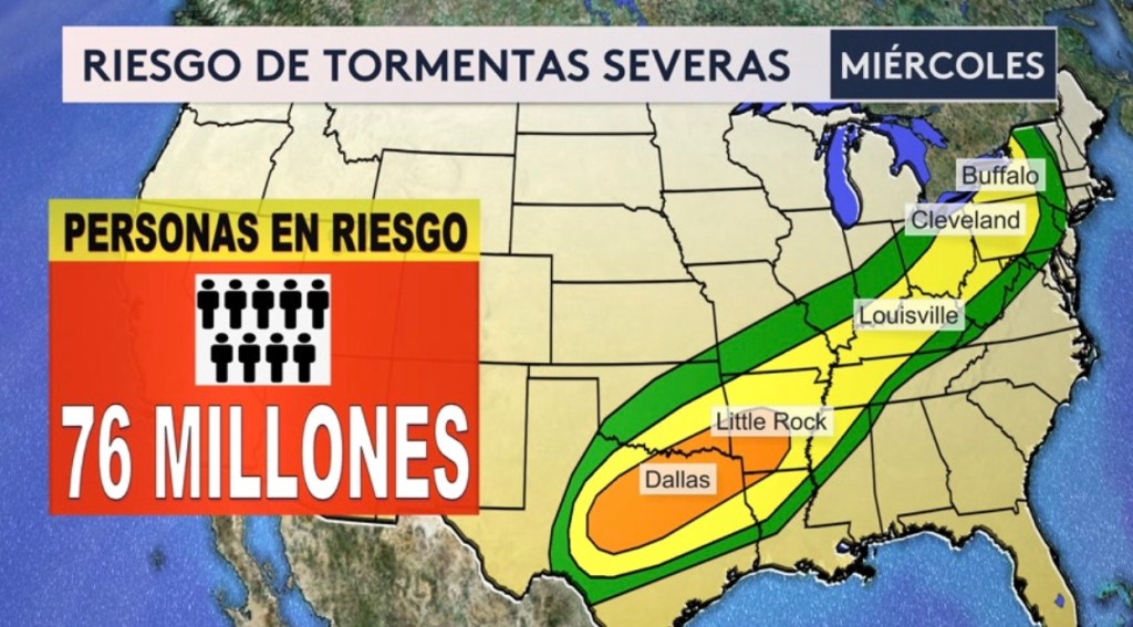 •Hoy, 76 millones de personas estarán bajo el riesgo de tiempo severo desde Texas hasta Vermont. El mayor riesgo es para las ciudades dentro de la sombra naranja que incluyen Dallas, Fort Worth, Arlington en Texas y Little Rock en Arkansas. En la sombra naranja, se espera granizo de más de 2”, en la sombra amarilla pocos tornados y en la sombra verde vientos dañinos