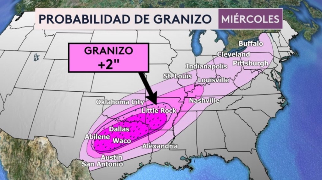 •Probabilidad de granizo hoy, mostrado la zona que pudiera ver granizo de más de 2” en diámetro (tamaño de un limón o huevo) que incluye las ciudades de Dallas, Fort Worth, Waco en Texas y Little Rock en Arkansas