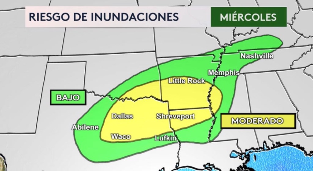 •Riesgo de inundaciones hoy desde Texas hasta Kentucky con el mayor riesgo en la sombra amarilla que incluye las ciudades de Dallas, Waco en Texas; Shreveport en Louisiana; y Little Rock en Arkansas