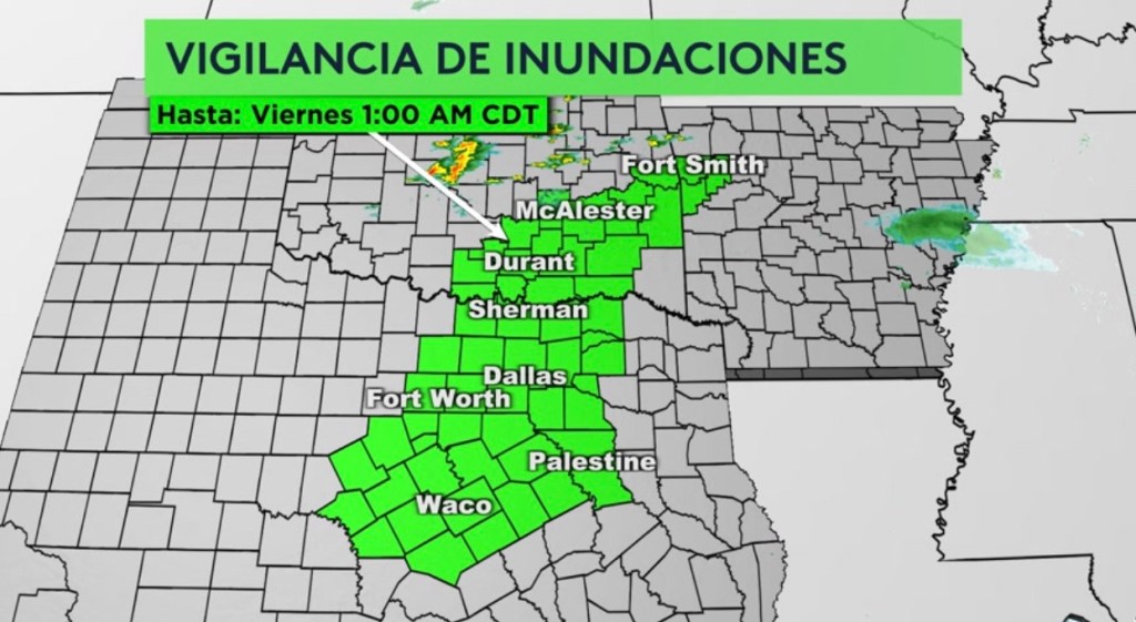 •Vigilancia de inundaciones hasta tarde por la noche el jueves para Texas, Oklahoma y Arkansas