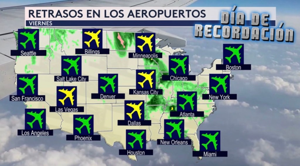 •Retrasos en los aeropuertos el jueves y el viernes para el fin de semana festivo. Posibles retrasos el jueves en San Francisco, California debido a los fuertes vientos y en Billings, Montana debido a las fuertes nevadas. Posibles retrasos el viernes en Las Vegas, Nevada debido a los fuertes vientos y en Dallas, Texas; Kansas City, Missouri; Minneapolis, Minnesota; y Billings, Montana debido a las precipitaciones